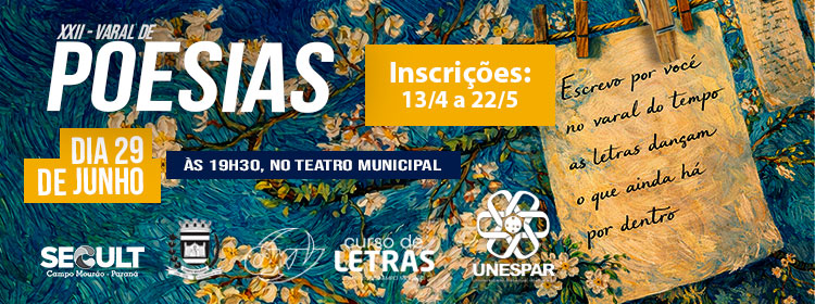 Inscrições do XXII Varal de Poesias: https://forms.gle/C5ggUwTTQtZxu4vu6