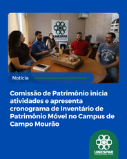 Os membros da Comissão de Patrimônio da Universidade Estadual do Paraná (Unespar), campus de Campo Mourão, nomeados pela Portaria Reitoria/Unespar nº 565, de 13 de abril de 2026 – os agentes universitários Joab Jacometti de Oliveira, Caio Cesar dos Santos e Jaqueline Arguelho da Silva – reuniram-se na manhã desta quinta-feira (16) para a primeira reunião da comissão local. A diretora-geral do campus, profa. Me. Ceres América Magalhães Ribas, e o estagiário do setor de Coordenação Administrativa, Eduardo Batista, também estiveram presentes.